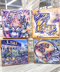 The LSU Legacy Mini Collection is a bold, high-energy set of four hand-painted 4 × 4 inch canvases celebrating the pride, power, and tradition of Louisiana State University. This collection features iconic LSU imagery—including the fierce tiger, the state silhouette, Tiger Stadium, and the classic LSU helmet—each rendered in expressive brushstrokes and vibrant purple and gold tones.