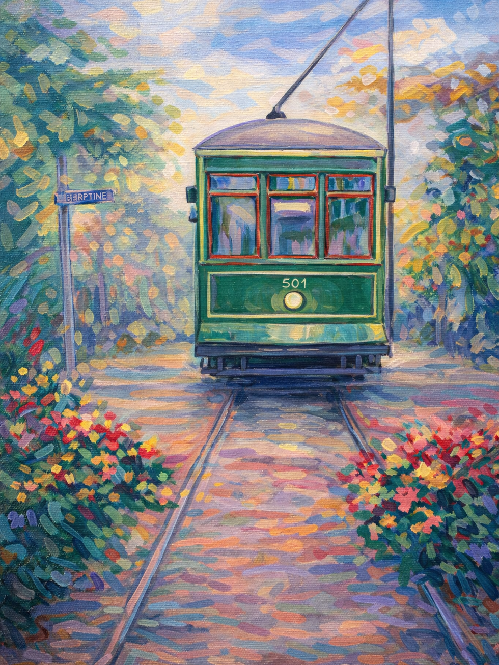 Serpentine Serenity captures the timeless charm of a New Orleans streetcar gliding softly down the tracks beneath a canopy of dappled light. Painted in vibrant, impressionistic strokes, the iconic green streetcar becomes the heart of the composition—surrounded by lush florals and warm, glowing hues that suggest movement, music, and Southern ease.